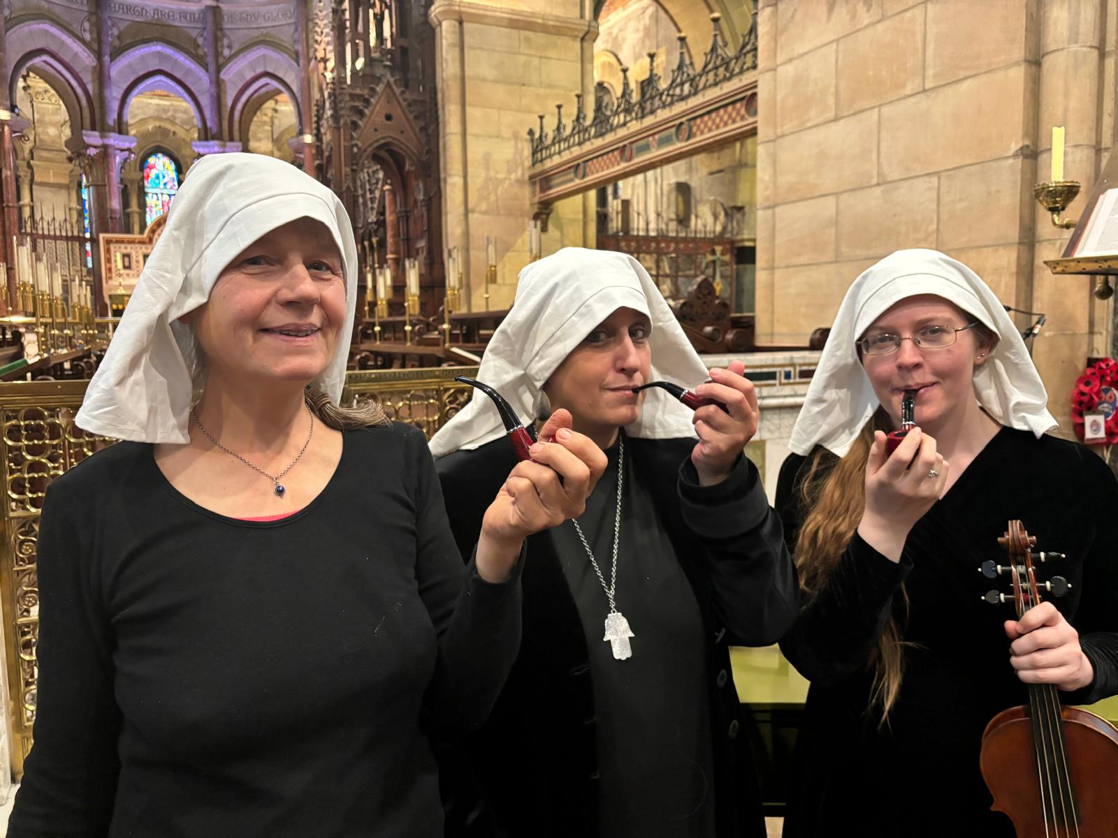 Timely Paschal drama was reflected in the music chosen and was dazzling in the capable voices of the group’s vocalist Josie Ryan with guest soprano, Belinda Montgomery. The staging and delivery of Guillaume Bouzignac’s motet Ecce Homo featuring Pontius Pilate in the pulpit and a bloodthirsty crowd at altar steps below was riveting…